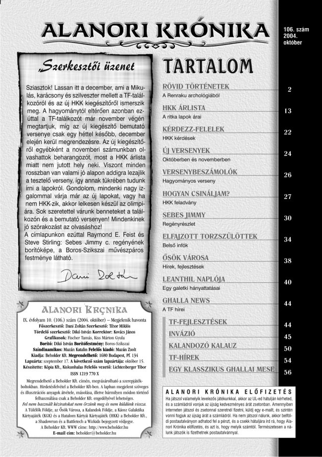 Alanori Krónika 106. (2004. október) - Tartalomjegyzék