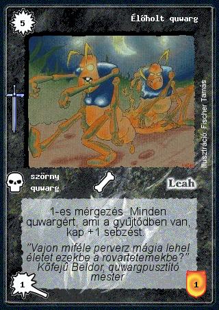 Kiadás: Hőskorszak Gyakoriság: nem gyakori Lapszín (isten): Leah Típus: szörny Altípus: quwarg Szöveg: 1-es mérgezés. Minden quwargért, ami a gyűjtődben van, kap +1 sebzést. Szinesítő szöveg: "Vajon miféle perverz mágia lehel életet ezekbe a rovartetemekbe?" Kőfejű Beldor, quwargpusztító mester Illusztráció: Fischer Tamás