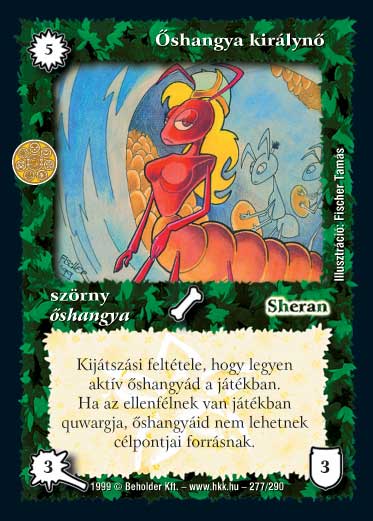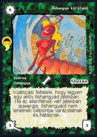 Kiadás: Aranyforrás, Túlélők Földje Gyakoriság: ritka Lapszín (isten): Sheran Típus: szörny Altípus: őshangya Szöveg: Kijátszási feltétele, hogy legyen egy aktív őshangyád játékban. Ha az ellenfélnek van játékban quwargja, őshangyáid nem lehetnek célpontjai varázslatnak és hatásnak. Illusztráció: Fischer Tamás