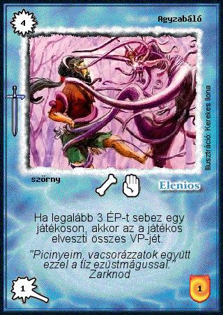 Kiadás: Hőskorszak Gyakoriság: nem gyakori Lapszín (isten): Elenios Típus: szörny Szöveg: Ha legalább 3 ÉP-t sebez egy játékoson, akkor az a játékos elveszti összes VP-jét. Szinesítő szöveg: "Picinyeim, vacsorázzatok együtt ezzel a tíz ezüstmágussal." Zarknod Illusztráció: Kerekes Ilona