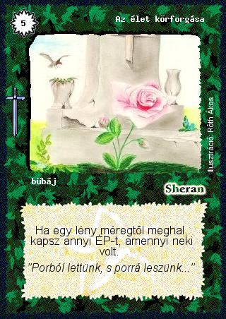 Kiadás: Hőskorszak Gyakoriság: ritka Lapszín (isten): Sheran Típus: bűbáj Szöveg: Ha egy lény méregtől meghal, kapsz annyi ÉP-t, amennyi neki volt. Szinesítő szöveg: "Porból lettünk, s porrá leszünk..." Illusztráció: Rőth Ákos