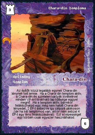 Kiadás: Chara-din visszatér Gyakoriság: ritka Lapszín (isten): Chara-din Típus: építmény Altípus: templom Szöveg: Az építők közül legalább egynek Chara-din lénynek kell lennie. Ha a Chara-din templom aktív, a Chara-din és színtelen kártyák kivételével minden VP-ért kirakható lap költsége eggyel megnő. Ha a templom aktív, bármikor feláldozhatod egy, még nem halott Chara-din lényedet, 2 ÉP-t sebezve így célpont játékoson (de ha két templomod van, akkor nem sebzel 4 ÉP-t egy lény feláldozásával). Ezt a képességet egy körben csak egyszer használhatod. Illusztráció: Nagy Zoltán