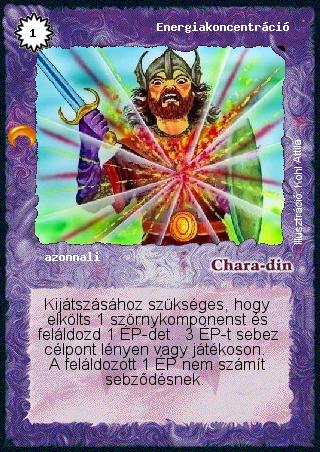 Kiadás: Chara-din visszatér, Túlélők Földje, Védnök 2025 Gyakoriság: ritka Lapszín (isten): Chara-din Típus: azonnali Szöveg: Kijátszásához szükséges, hogy elkölts 1 szörnykomponenst és feláldozd 1 ÉP-det. 3 ÉP-t sebez célpont lényen vagy játékoson. A feláldozott 1 ÉP nem számít sebződésnek. Illusztráció: Kohl Attila