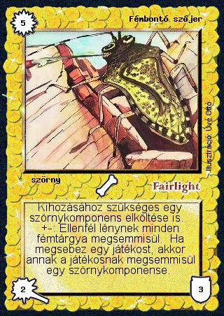 Kiadás: Alappakli, 1. kiadás, Alappakli, 2. kiadás, Alappakli, 3. kiadás Gyakoriság: ritka Lapszín (isten): Fairlight Típus: szörny Szöveg: Kihozásához szükséges egy szörnykomponens elköltése is. +-: Ellenfél lénynek minden fémtárgya megsemmisül. Ha megsebez egy játékost, akkor annak a játékosnak megsemmisül egy szörnykomponense. Illusztráció: Úvé Ottó