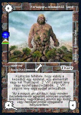 Kiadás: A föld síkja (Invázió) Gyakoriság: ritka Lapszín (isten): Tharr Típus: szörny Altípus: bazaltelementál Szöveg: Kijátszási feltétele, hogy eldobj a kezedből egy épületet, egy elementált vagy két Tharr lapot. 2 VP: célpont lény vagy épület passzivizálódik. 2 VP: célpont lény vagy épület aktivizálódik. Szinesítő szöveg: "Az a mágus, aki azt hiszi, hogy minden bazaltelementál agyatlan, könnyen uralható teremtmény, nagyot téved, amikor egy lordot vagy herceget próbál szolgálatra kényszeríteni." Illusztráció: Szatmári Zsolt