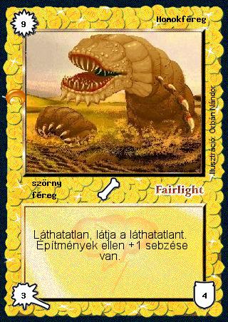 Kiadás: Chara-din visszatér Gyakoriság: ritka Lapszín (isten): Fairlight Típus: szörny Altípus: féreg Szöveg: Láthatatlan, látja a láthatatlant. Építmények ellen +1 sebzése van. Illusztráció: Orbán Nándor