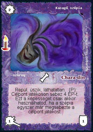 Kiadás: Múltidéző Gyakoriság: gyakori Lapszín (isten): Chara-din Típus: szörny Szöveg: Repül, úszik, láthatatlan. (P): Célpont játékoson sebez 4 ÉP-t. Ezt a képességet csak akkor használhatod, ha a szépia egyszer már megsebezte a célpont játékost. Illusztráció: Mojzer Krisztina