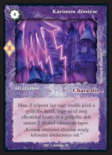 Kiadás: Misztikus Erők Gyakoriság: ritka Lapszín (isten): Chara-din Típus: általános Altípus: - Szöveg: Max. 2 célpont lap vagy önálló jelző a gyűjtőbe kerül, vagy nézd meg ellenfeled kezét, és a gyűjtőbe dob 2 általad választott lapot. Szinesítő szöveg: "Karimon döntéseinek általában mindig kellemetlen következménye volt." Illusztráció: Ashantye