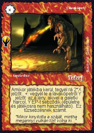 Kiadás: Alappakli, 5. kiadás (Ősök városa) Gyakoriság: ritka Lapszín (isten): Tolvaj Klán Típus: testrész Szöveg: Amikor játékba kerül, tegyél rá 2*X jelzőt. +: vegyél le a lávaköpetről Y jelzőt: az a lény, akivel a galetki harcol, Y ÉP-t sebződik (épületre és játékosra nem használható). Ez tűzsebzésnek számít. Szinesítő szöveg: "Mikor kinyitotta a száját, mintha megannyi vulkán tört volna ki..." Illusztráció: Szász Gábor