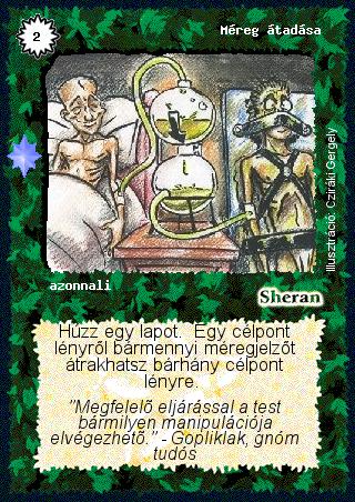 Kiadás: Ezüsthajnal Gyakoriság: gyakori Lapszín (isten): Sheran Típus: azonnali Szöveg: Húzz egy lapot. Egy célpont lényről bármennyi méregjelzőt átrakhatsz bárhány célpont lényre. Szinesítő szöveg: "Megfelelő eljárással a test bármilyen manipulációja elvégezhető." - Gopliklak, gnóm tudós Illusztráció: Cziráki Gergely