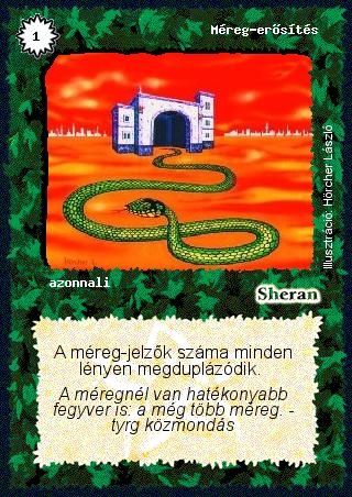 Kiadás: Alappakli, 1. kiadás, Alappakli, 2. kiadás, Alappakli, 3. kiadás, Alappakli, 4. kiadás Gyakoriság: nem gyakori Lapszín (isten): Sheran Típus: azonnali Szöveg: A méreg-jelzők száma minden lényen megduplázódik. Szinesítő szöveg: A méregnél van hatékonyabb fegyver is: a még több méreg. - tyrg közmondás Illusztráció: Hörcher László