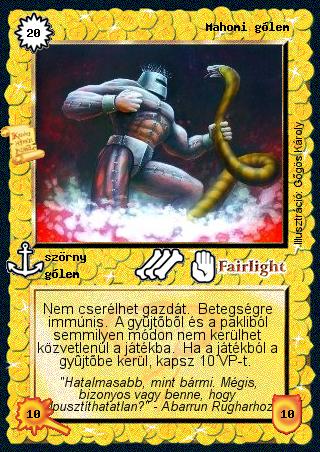 Kiadás: Aranyforrás Gyakoriság: ultra ritka Lapszín (isten): Fairlight Típus: szörny Altípus: gólem Szöveg: Nem cserélhet gazdát. Betegségre immúnis. A gyűjtőből és a pakliból semmilyen módon nem kerülhet közvetlenül a játékba. Ha a játékból a gyűjtőbe kerül, kapsz 10 VP-t. Szinesítő szöveg: "Hatalmasabb, mint bármi. Mégis, bizonyos vagy benne, hogy elpusztíthatatlan?" - Abarrun Rugharhoz Illusztráció: Gőgös Károly