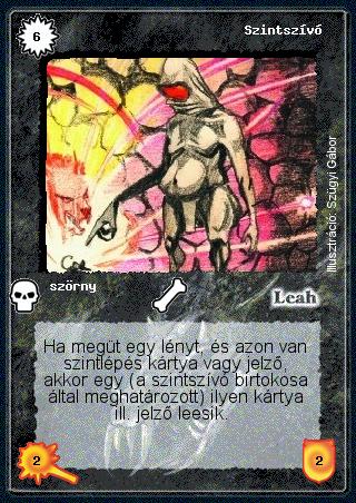 Kiadás: Alappakli, 1. kiadás, Alappakli, 2. kiadás, Alappakli, 3. kiadás, Alappakli, 4. kiadás Gyakoriság: nem gyakori Lapszín (isten): Leah Típus: szörny Szöveg: Ha megüt egy lényt, és azon van szintlépés kártya vagy jelző, akkor egy (a szintszívó birtokosa által meghatározott) ilyen kártya ill. jelző leesik. Illusztráció: