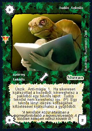 Kiadás: Káoszkatlan, Alappakli, 8. kiadás Gyakoriság: ritka Lapszín (isten): Sheran Típus: szörny Altípus: teknős Szöveg: Úszik. Anti-mágia: 1. Ha sikeresen kijátszottad a kezedből, kikereshetsz a paklidból egy teknős lapot. Tudós teknőst nem kereshetsz igy. (P): Egy teknős lényt idézési költségének kifizetésével kijátszhatsz a gyűjtődből. Szinesítő szöveg: "A teknősök közül általában a legmegfontoltabb a legveszélyesebb. A többiek kételyek nélkül követik őt." Illusztráció: Ruzsinszki Zsolt