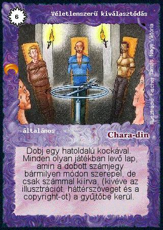 Kiadás: Chara-din visszatér Gyakoriság: ritka Lapszín (isten): Chara-din Típus: általános Szöveg: Dobj egy hatoldalú kockával. Minden olyan játékban levő lap, amin a dobott számjegy bármilyen módon szerepel, de csak számmal kiírva, (kivéve az illusztrációt, háttérszöveget és a copyright-ot) a gyűjtőbe kerül. Illusztráció: Fischer Tamás, Nagy Viktória