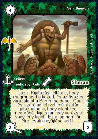 | | (AK139) Teknősnek számít a Vén Doemon, amikor reakcióként kijátszom. Itt nem arról van szó, mint a szkritterek vagy a Dranadáni kőtörő esetében, ahol kijátszhatom a lapot varázslatként is, de akkor nem lény. Itt egy olyan teknős lényről van szó, amit reakcióként tudok kijátszani.
