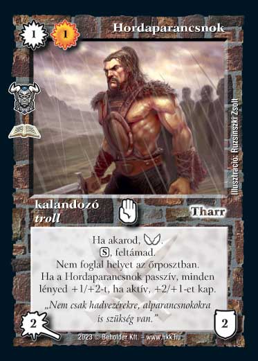 Kiadás: Trollok (Zén) Gyakoriság: ritka Lapszín (isten): Tharr Típus: kalandozó Altípus: troll Szöveg: Ha akarod, _repül. (S), feltámad. Nem foglal helyet az őrposztban. Ha a Hordaparancsnok passzív, minden lényed +1/+2-t, ha aktív, +2/+1-et kap. Szinesítő szöveg: "Nem csak hadvezérekre, alparancsnokokra is szükség van." Illusztráció: Ruzsinszki Zsolt