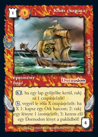 Szöveg: (K2), ha egy lap gyűjtőbe kerül, rakj rá 1 csapásjelzőt! (S), vegyél le róla X csapásjelzőt: ha X 1: kapsz egy Ork harcost; 2: rakj egy lényre 1 izomjelzőt; 3: keress elő egy Dornodon lényt a paklidból!