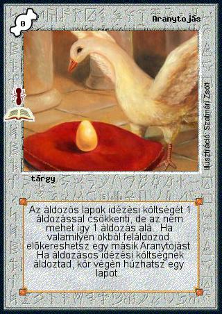 Kiadás: Az őshangya boly (Zén) Gyakoriság: ritka Lapszín (isten): Színtelen Típus: tárgy Szöveg: Az áldozós lapok idézési költségét 1 áldozással csökkenti, de az nem mehet így 1 áldozás alá. Ha valamilyen okból feláldozod, előkereshetsz egy másik Aranytojást. Ha áldozásos idézési költségnek áldoztad, kör végén húzhatsz egy lapot. Illusztráció: Szatmári Zsolt
