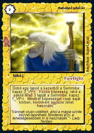 Kiadás: Alanori Krónika Gyakoriság: ritka Lapszín (isten): Fairlight Típus: bűbáj Szöveg: Dobd egy lapod a kezedből a Semmibe: kapsz 3 VP-t. Közös képesség: rakd a paklid felső 3 lapját a Semmibe: kapsz 1 VP-t. Mindkét képességet csak saját körben, körönként egyszer lehet használni. Szinesítő szöveg: "Vannak olyan vidékek, ahol a mágia szinte kézzel tapintható. Mindenki érzi, a tehetségesebbek ki is használják." - Lady Terilien Illusztráció: Szalai László
