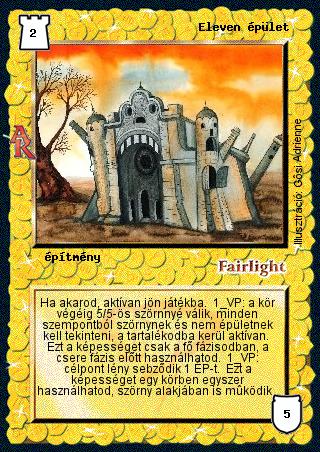 Kiadás: Alanori Krónika Gyakoriság: ritka Lapszín (isten): Fairlight Típus: építmény Szöveg: Ha akarod, aktívan jön játékba. 1 VP: a kör végéig 5/5-ös szörnnyé válik, minden szempontból szörnynek és nem épületnek kell tekinteni, a tartalékodba kerül aktívan. Ezt a képességet csak a fő fázisodban, a csere fázis előtt használhatod. 1 VP: célpont lény sebződik 1 ÉP-t. Ezt a képességet egy körben egyszer használhatod, szörny alakjában is működik. Illusztráció: Gősi Adrienne